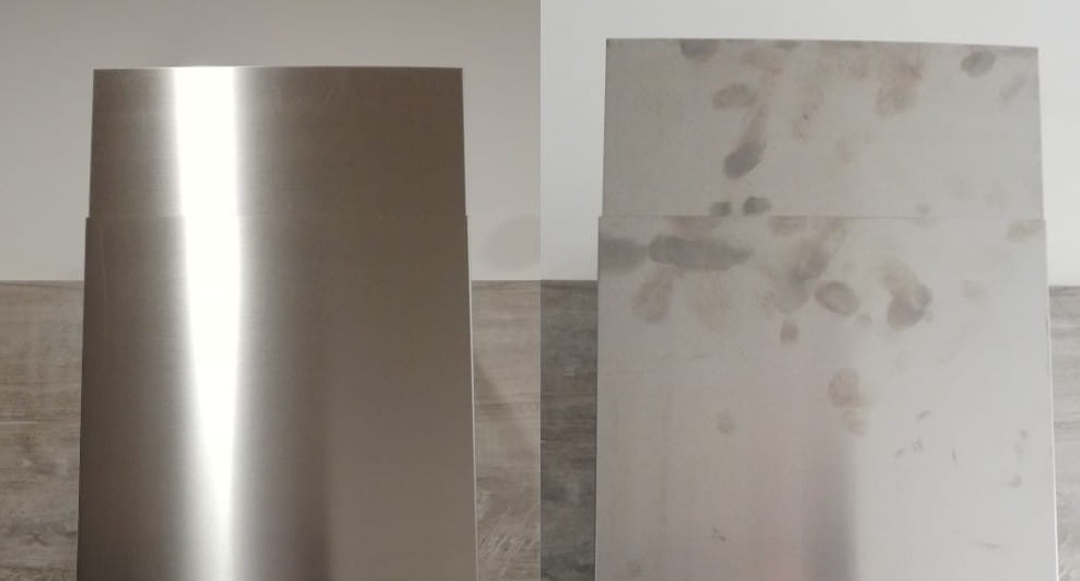 - Naneseme čistič na vlhkou houbičku a umyjeme nerezové části. Necháme působit a otřeme mokrým hadříkem s teplou vodou. Po každém otření hadřík důkladně vymácháme, aby nám nezanechával šmouhy.